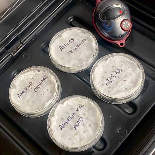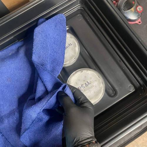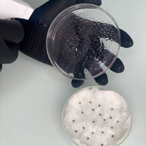 KannaGrowing Primera semana - Germinación en Placas de Petri sobre un invernadero calefactado, utilizando papel de cocina y pulverizando agua.
