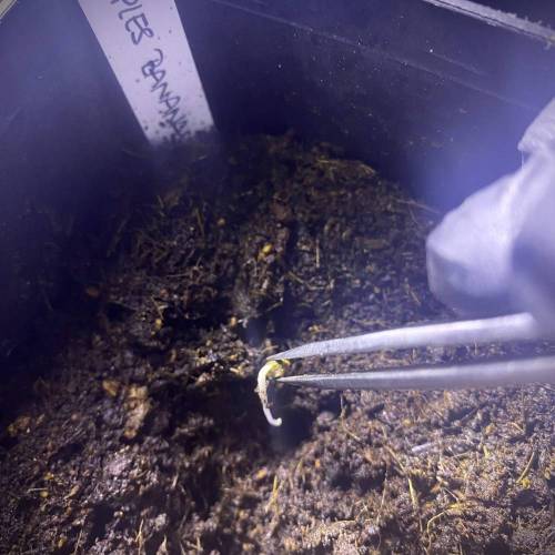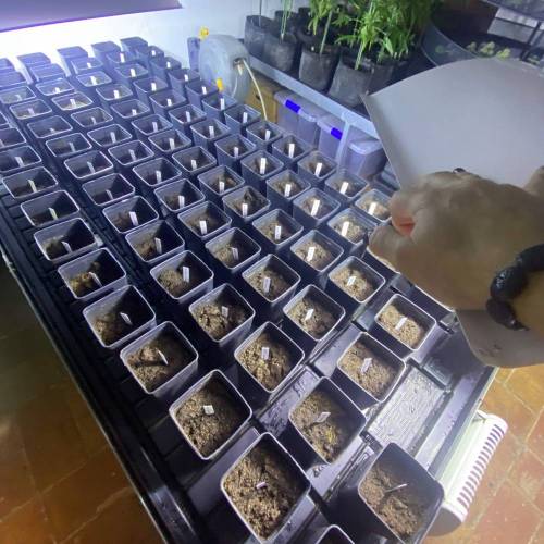 Cuando germinan las planto bien etiquetadas y pulverizo agua, sin regar. Así evitamos movimientos indeseados de las semillas.
