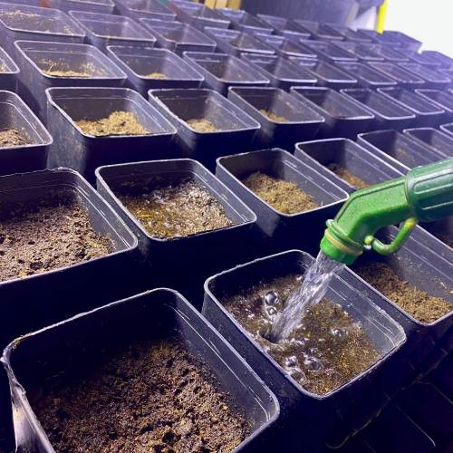 Riego con agua descalcificada, en esta ocasión 2 veces por semana, 10L para 80 macetas de 1L, necesitamos que las raíces colonicen el sustrato, ya que en breve comenzaremos con los trasplantes progresivamente.