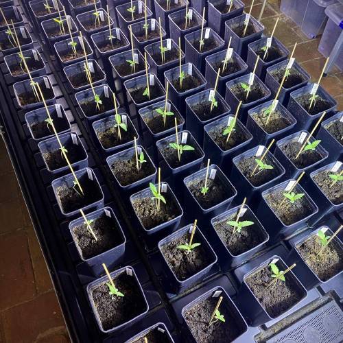 40 plantas por mesa en 4 variedades distintas + 7 extras que he colocado entre las mesas y que no he trasplantado, para ver el comportamiento final en la maceta de 1L.