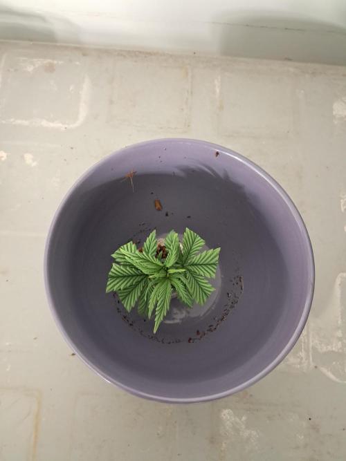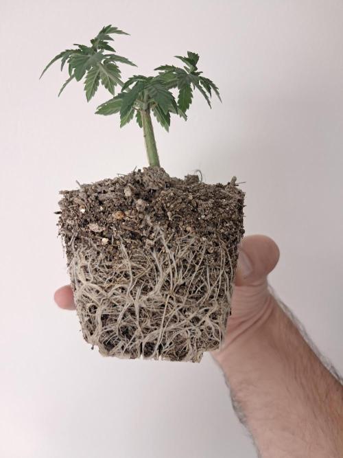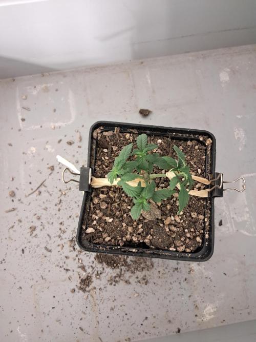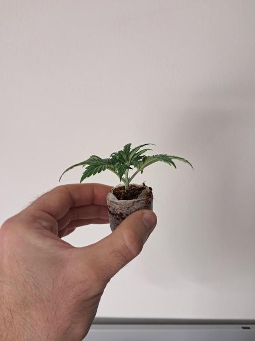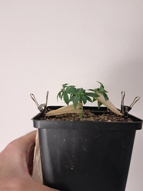 wikie Leider hatte ich die letzten Tage kaum Zeit um mich um mein kleines Mädchen zu kümmern. Aber das ist ja auch ein super Zeichen, wenn die Pflanze einfach ohne weiteres Zutun sich so super entwickelt. Nach 3 Tagen Keimen zwischen den Wattepads brauchte sie nochmal 2 Tage in der Erde um das Licht der Welt zu erblicken. Inzwischen ist sie Ende der 3ten Woche und es wurde allerhöchste Zeit, daß sie neue Schuhe und einen neuen Haarschnitt bekommt 😁 Heute wurde also die Schere angesetzt und der Haupttrieb über der 2ten Internodie eingekürzt. Den Abschnitt wurde mit Wurzelpulver in ein Kokospad unter ein Glas gesteckt, in der Hoffnung daraus eine weitere Pflanze zu ziehen. Danach wurde umgetopft und die Seitentriebe für das mainlining vorsichtig in Form gebracht. ------- Unfortunately, I barely had time over the past few days to take care of my little girl. But that’s actually a great sign when the plant grows so well without any extra attention. After 3 days of germinating between cotton pads, she needed another 2 days in the soil to see the light of day. Now she’s at the end of the third week, and it was high time she got new shoes and a new haircut 😁. So today, the scissors came out, and the main stem was trimmed above the second internode. The cutting was dipped in rooting powder and placed under a glass in a coconut pad in the hope of growing another plant from it. After that, she was repotted, and the side shoots were gently trained for mainlining.