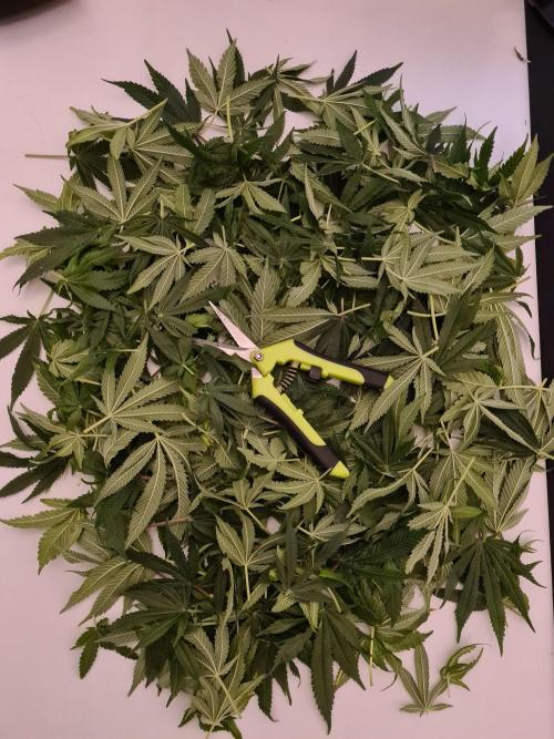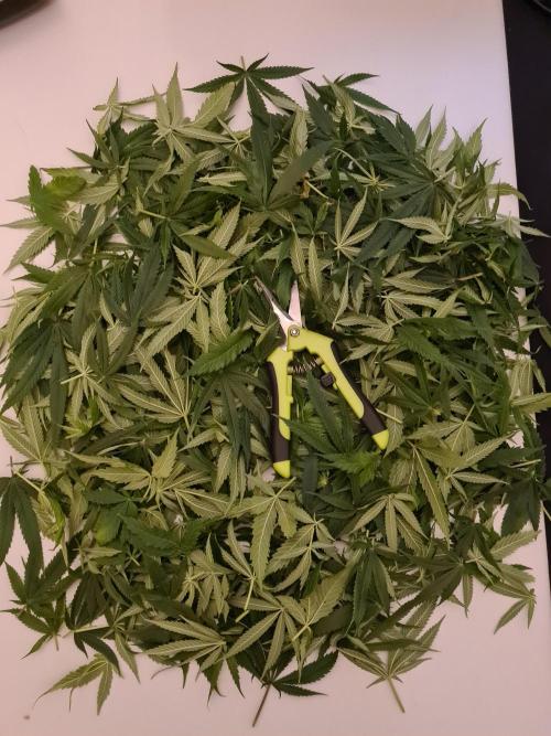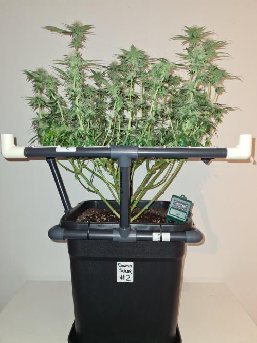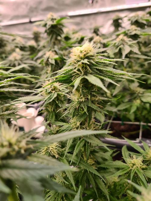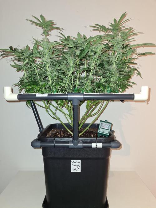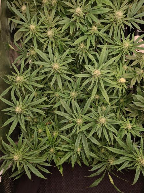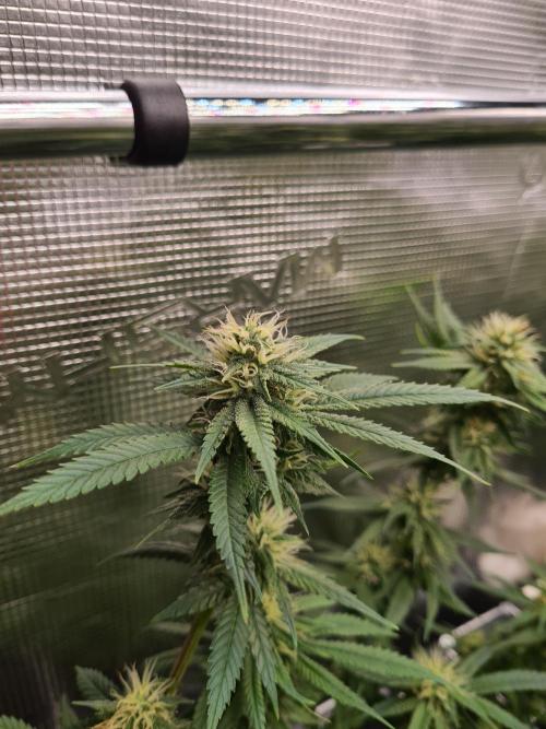 BLAZED Week 8 (17-3 to 23-3) 17-3 Temps: 17.4 to 21.9 degrees Humidity: 60% to 72% 18-3 Temps: 17.5 to 22.2 degrees Humidity: 54% to 65% 19-3 Temps: 17.9 to 22.4 degrees Humidity: 52% to 61% Watering: Both 500 ml. EC: 0.4 Watering: Both 1000 ml. EC: 1.4 Defoliated both plants and attached some shoots to the rack. She got really big fan leaves! I also supercropped some branches. 20-3 Temps: 18.2 to 22.8 degrees Humidity: 59% to 69% 21-3 Temps: 18.5 to 23.4 degrees Humidity: 57% to 67% Watering: Both 1000 ml. 22-3 Temps: 19.4 to 24.1 degrees Humidity: 55% to 67% Watering: Both 1000 ml. Set the strength of the light to 50% 23-3 Temps: 19.8 to 24.8 degrees Humidity: 58% to 67% Watering: Both 1000 ml. As you can see, instead of removing the leaves, i tucked down all the leaves to open up the canopy. I will see if i like this method as its the first time i try this. I also attached some more shoots to the rack, its looking nicely spread out now :) The #2 makes my fingers very sticky and smells really strong! I love it!