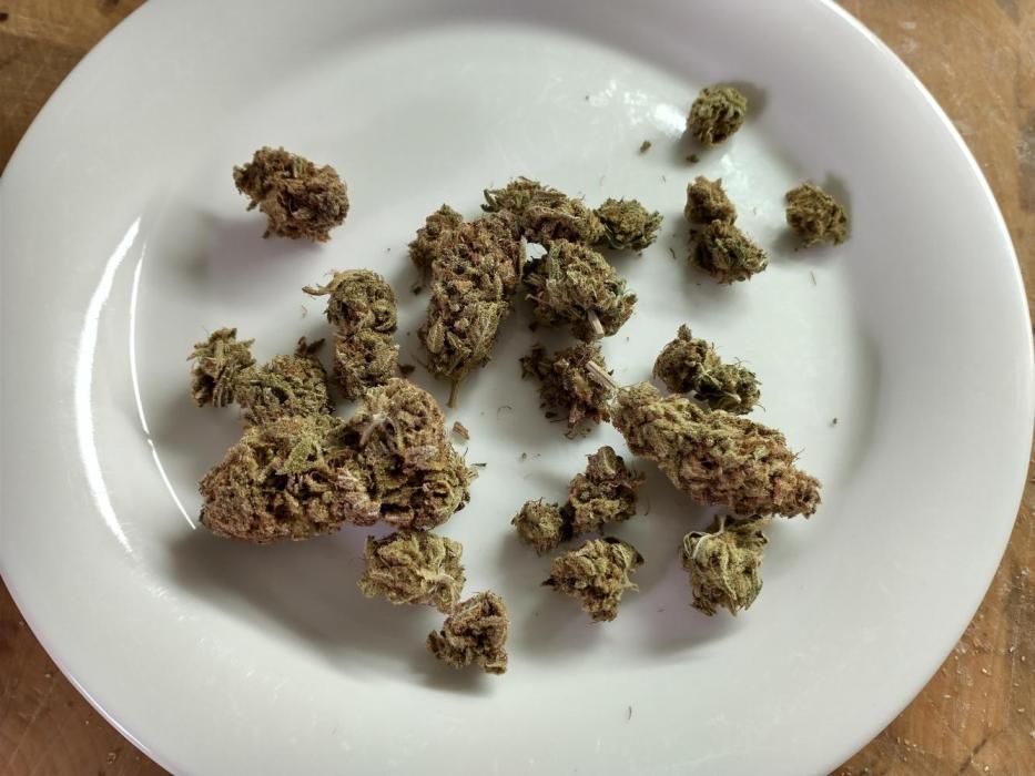 I gave the plant 4 litres of water yesterday to get some humidity in the nugs before chopping the plant. I removed fan leaves from the plant, carefully lifted the trellis net and cut the plant from the stem. Hang upside down, remove seeded nug and opened it immediately to remove the seeds. I landed with 30-40 seeds with a fast count, plenty to continue the strain progress.