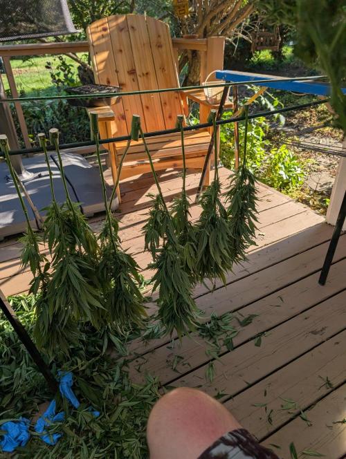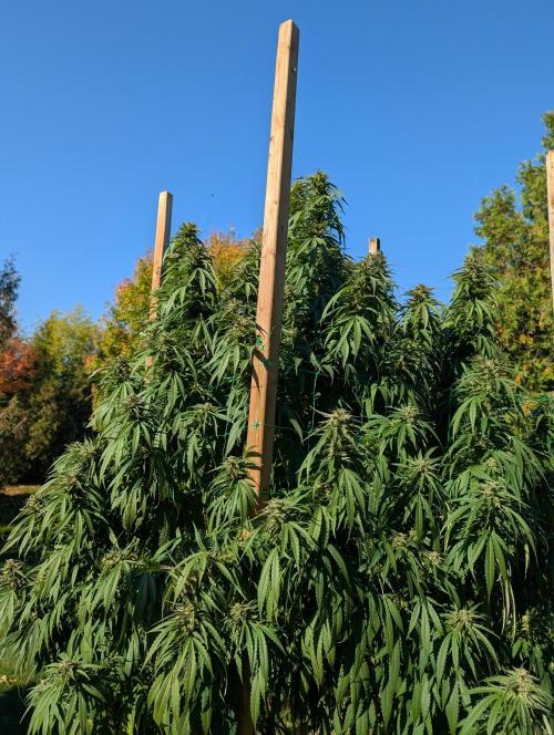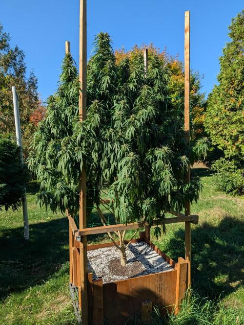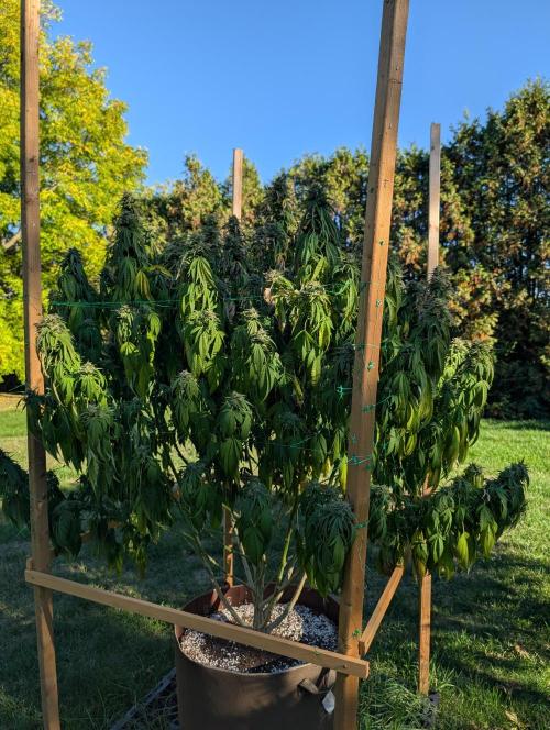 Grow_for_Happiness Missed posting last week because life was busy but we're back this week, although a few days late! The girls are in full flower now and just loving life. Temps have come down to a more seasonal range so watering are now every 3-3.5 days. The larger of the two has a nice deep green and probably the most healthy looking of the plants. Towering 105" from the huge trunk at the base she is starting to produce nice sized buds. The smaller plant is looking good, around 80" tall, but a little unhappy. Lighter colour and droops earlier, pretty sure she just wishes for a larger fabric pot, guess 35 gallon isn't enough for her. Have moved to feeding twice a week to try and combat the yellowing and dropping of the leaves, see if makes a difference next week. I'm thinking next year it's 36"x36"x18" beds instead, or maybe a 60 gallon fabric pot if I can find em for a good price. Oh, and the smell on these girls ls is quite noticable from the moment you step out my back door, about 100' away. Neighbors are gonna be complaining about "that skunk" again this year hahahahaha.