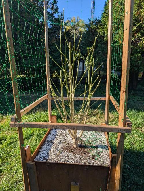 Grow_for_Happiness Well the quest to stay natural and not trellis ended this week hahaha. Had a good windstorm early week and had a few branches break on other plants I'm growing, so figured better trellis now before the buds come in. The girls were dry so dragged them up onto plastic pallets, have great air circulation and makes it easy to build a frame out of 2x2x10 wood. Speaking of buds, I've switched to Bloom nutrients now, back to Reefertilizer once a week feeding of 12L solution.