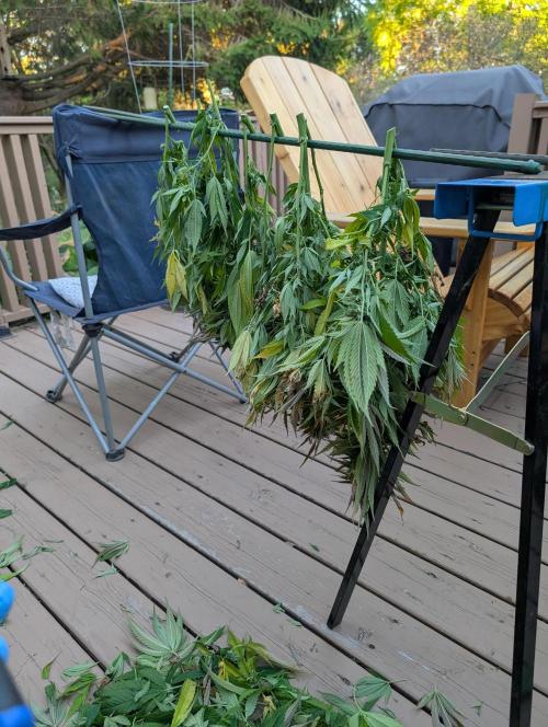 Grow_for_Happiness As the cold night are upon us the girls are fattening up and putting on their best fall colours. Seeing lots of leaves starting to go purple on the smaller plant while the larger is for no still a healthy deep green. Maybe with these cold nights early in flower we will see some pretty good colours 🤞. Smaller plant got a good leaf cleanup early on the week, she really needed it and it looking much happier afterwards. Ran out of time will be defoliating the larger one tomorrow. Switched the nutrients to Nutes Nutrients, only because I ran out of Reefertilizer and didn't want to buy more when I had spare nutrients on the basement. They seem happy with the change, maybe feeding a touch heavy will fail back to feed, feed, water instead of feeding every time. Water is roughly every 3 days right now 24L at a time per plant. A month or less to go now, let's get to that finish line!