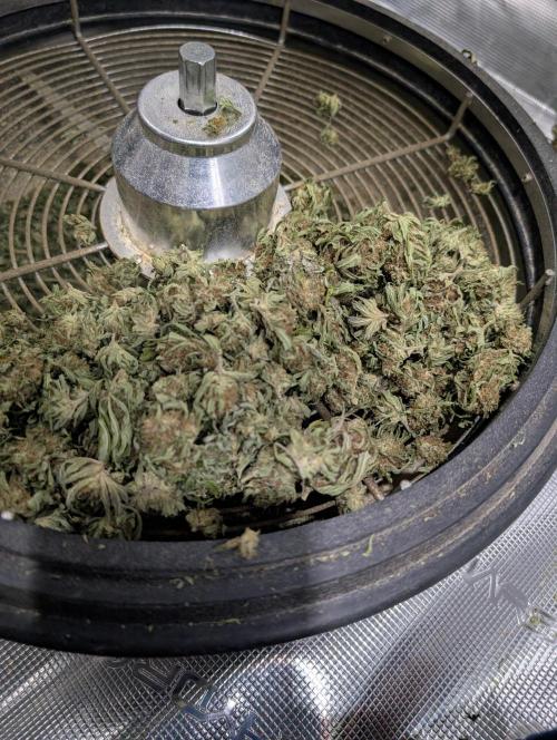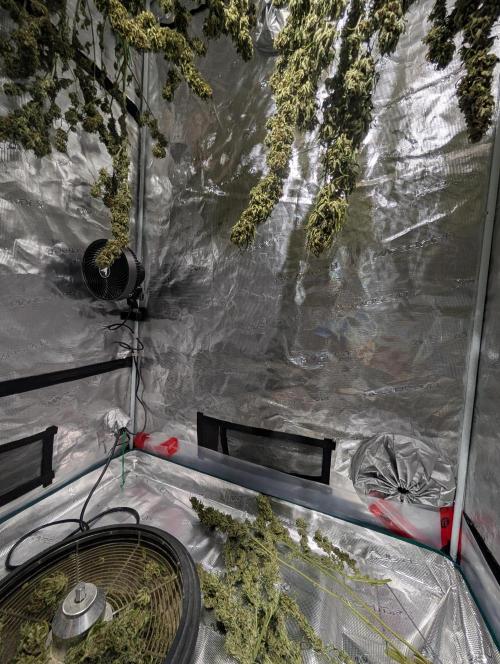 Grow_for_Happiness The time has come! The girls were taken down over two days once trichomes started going red. Maybe 10% which is my usual aim. They're now chopped up into 2-3' lengths and packed into my 4x8, full wall to wall 😁. 10-14 days at 58% humidity and steady airflow and these girls will be ready to sample before cute. Beautiful colours and nice looking buds. The smell when trimming was fruity citrus and stank.