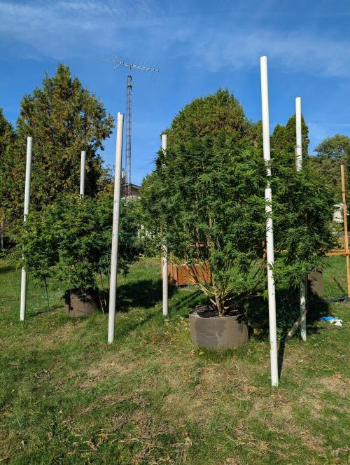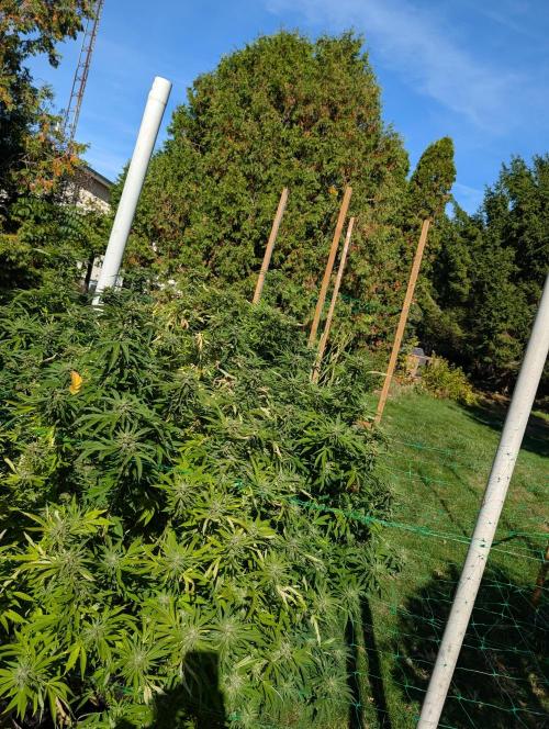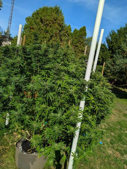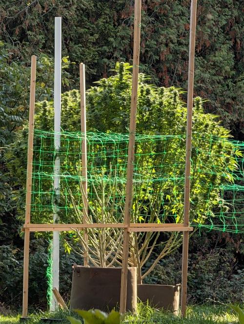 Grow_for_Happiness Me last week: I'm going to let these go natural and try not to trellis. Me after finding two branches broken 95% off the plant "time to MacGyver a trellis!!". So MacGyver I did and riffed up what is now my favorite way to trellis outdoors. Pipes are drainage pipes I had laying around, slid over stakes made out of scrap 2x2 that were three feet long, with half above and half below ground. Two screws into each to secure, slide the netting over and we're done! A little more precise measuring at the start, but nothing too difficult. Was a hot week above 40°C with humidity again, so watering daily but plants loving it just drinking their faces off.