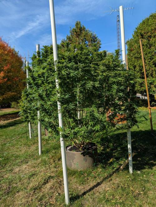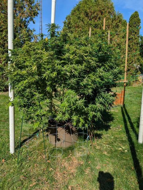 Weather is finally back to more seasonal temperatures and the girls are just loving life. They've both grown another 10-12" and are still keeping with their natural round shape. Healthy looking colour and buds sites just staring to fill in near end of the week. These girls are gonna put a strain on the trellis setup that's for sure! The smaller of the two isn't looking quite as healthy with some drooping and yellowing of lower leaves or inner leaves. Inner leaves usually due to lack of sun, for sure need to cl an then upma bit this week. The drooping I suspect is caused by the smaller pot. Shes only on a 35 gallon where her sister is in a 45 gallon and I think it's making the difference. Similar to my OG Kush in a 35 gallon, just not enough room for the roots to expand and therefore drinking up the water too fast and stressing the plant a bit. Will effect yield a bit, but not too bad if pruned properly. Will have to get in there and remove some leaves and unimportant bud sites to help her out a bit. Otherwise the other plant is enormous, and still a perfect sphere of weedy goodness. Healthy looking but also needing a bit of a tidying of leaves. Nice strong stem and filling the pots but not looking stressed like the other plant in the smaller pot. Bumped up nutrient feed to twice a week to see if helps the smaller plant out without overfeeding. Should notice a difference by next week.