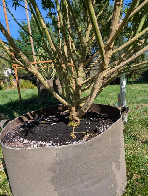 Grow_for_Happiness Girls got transplanted into three gallon fabric pots mid week. Roots were crazy and could tell they wanted more space. Used HP Pro mix and buffed with water and Reefertilizer grow. Looked happy next day, love the nursery bags rarely ever any transplant shock. Removed the bottom two sets of leaves and branches from each plant.