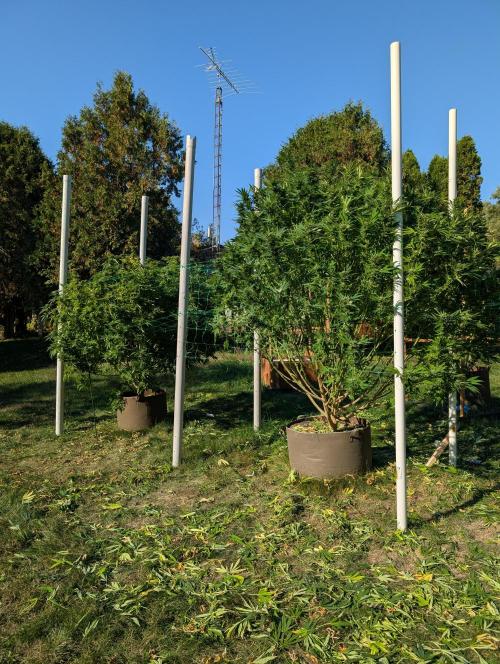Grow_for_Happiness Me last week: I'm going to let these go natural and try not to trellis. Me after finding two branches broken 95% off the plant "time to MacGyver a trellis!!". So MacGyver I did and riffed up what is now my favorite way to trellis outdoors. Pipes are drainage pipes I had laying around, slid over stakes made out of scrap 2x2 that were three feet long, with half above and half below ground. Two screws into each to secure, slide the netting over and we're done! A little more precise measuring at the start, but nothing too difficult. Was a hot week above 40°C with humidity again, so watering daily but plants loving it just drinking their faces off.