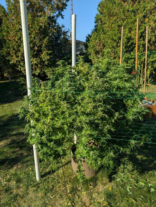 Weather is finally back to more seasonal temperatures and the girls are just loving life. They've both grown another 10-12" and are still keeping with their natural round shape. Healthy looking colour and buds sites just staring to fill in near end of the week. These girls are gonna put a strain on the trellis setup that's for sure! The smaller of the two isn't looking quite as healthy with some drooping and yellowing of lower leaves or inner leaves. Inner leaves usually due to lack of sun, for sure need to cl an then upma bit this week. The drooping I suspect is caused by the smaller pot. Shes only on a 35 gallon where her sister is in a 45 gallon and I think it's making the difference. Similar to my OG Kush in a 35 gallon, just not enough room for the roots to expand and therefore drinking up the water too fast and stressing the plant a bit. Will effect yield a bit, but not too bad if pruned properly. Will have to get in there and remove some leaves and unimportant bud sites to help her out a bit. Otherwise the other plant is enormous, and still a perfect sphere of weedy goodness. Healthy looking but also needing a bit of a tidying of leaves. Nice strong stem and filling the pots but not looking stressed like the other plant in the smaller pot. Bumped up nutrient feed to twice a week to see if helps the smaller plant out without overfeeding. Should notice a difference by next week.