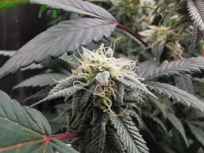 Her buds are shorter than the other phenos but look way more compact. Her leaves are looking darker than the rest but less purple
