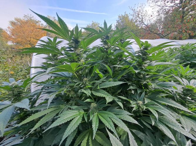 Oyziphar The day length has dropped to 12,5 hours ⏰⏰⏰ 👉 One Cookies Gelato plant outdoor in the open ground 🌞🌧️🌈. No manual watering. 👉 Two Liberty Haze plants in 24 liter containers. Daily watering. 🌡️ Temperatures were a bit low this week and lots of rain and wind 🌧️ 📢 I moved the Liberty Haze plants 🗽 outside the greenhouse 🏞️, because the chickens 🐔 take dustbaths in the greenhouse, creating a lot of dust on the buds. 💭 But outside - because the plants were too large - they fell due to the wind 💨. That is why I dug two holes 🕳️ in the ground and I placed the plants with their pots 🌲 in these holes, so they no longer fall