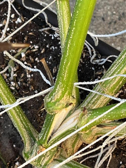 Aug 1: Plant is showing red petioles and there is a blue-ish tint to the leaves both of which are signs of P deficiency. Added another round of 50/50 malted barley and Power Bloom as top dressing.