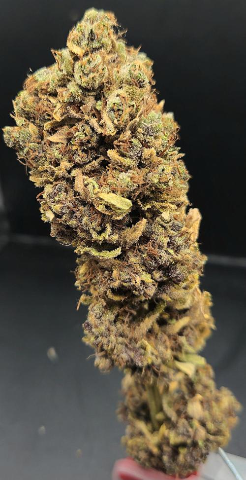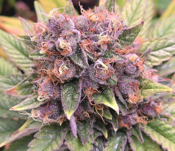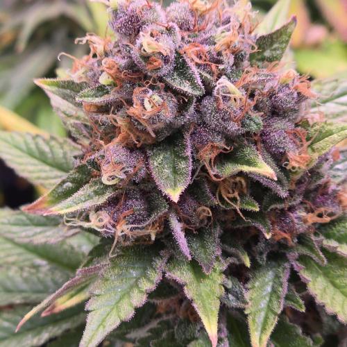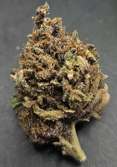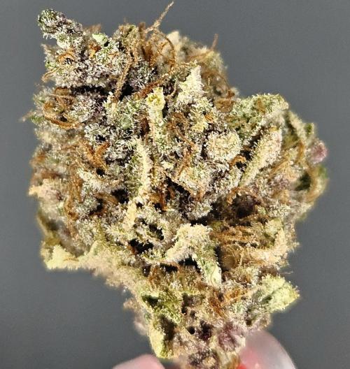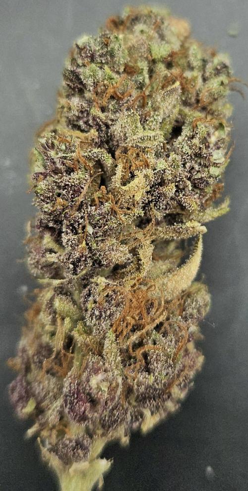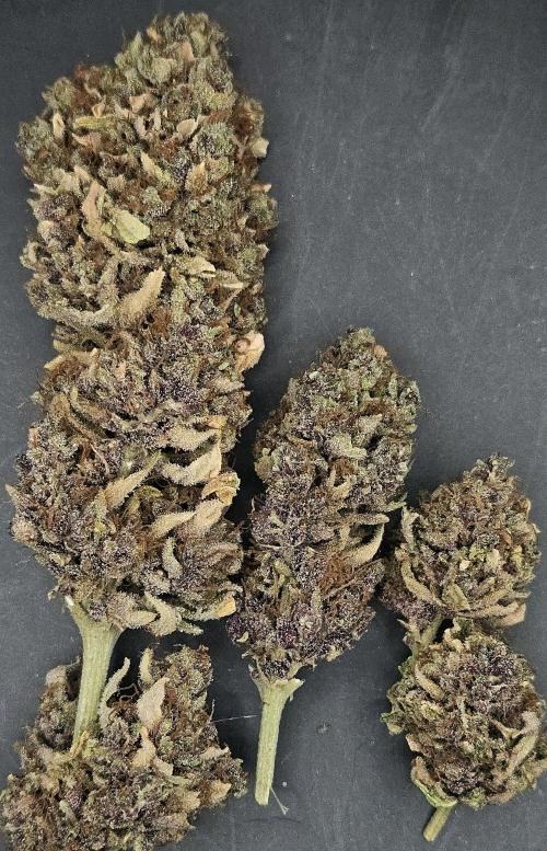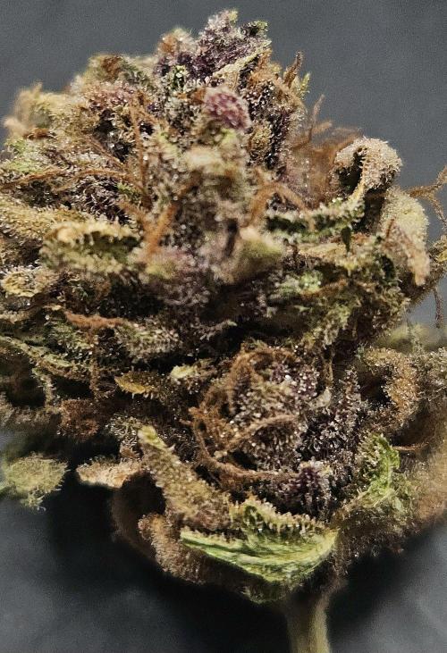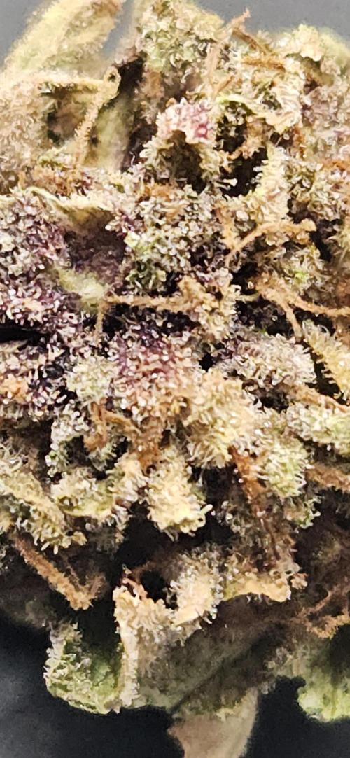 Die Knollen zeigen eine kompakte, dennoch leicht luftige Struktur mit einer auffallend dichten Harzschicht. Die Blüten sind mittelgroß bis groß, fest, aber nicht übermäßig hart, und lassen sich gut aufbrechen. Farblich dominieren tiefe Violetttöne, die mit olivgrünen Akzenten und bernsteinfarbenen Härchen durchzogen sind. Die Trichome schimmern wie feiner Frost und verleihen der Oberfläche ein leicht klebriges, kristallines Finish – ein deutlicher Hinweis auf die hohe Harzproduktion. Der Schnitt ist sauber, die Blätter eng anliegend, was auf eine sorgfältige Nachbearbeitung hinweist.