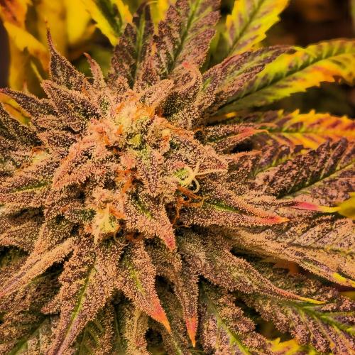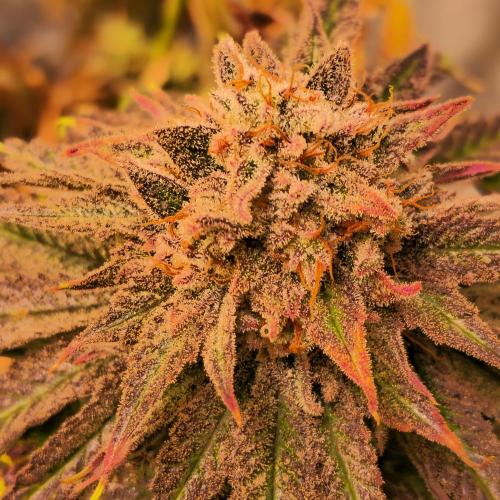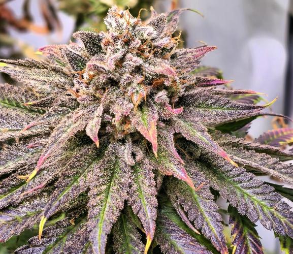 Die Knolle zeigt eine dichte, kompakte Struktur mit stark ausgeprägten Trichomen, was auf einen hohen Harzgehalt hindeutet. Die Blütenblätter sind eng anliegend und kräftig gefärbt, mit tiefvioletten bis fast schwarzen Nuancen, durchzogen von rosaroten und grünen Akzenten. Die Struktur wirkt fest, aber nicht übermäßig hart, typisch für Sorten mit ausgewogener Indica-Dominanz. Die starke Kristallbildung und Farbvielfalt deuten auf optimale Reife und hochwertige Genetik hin.