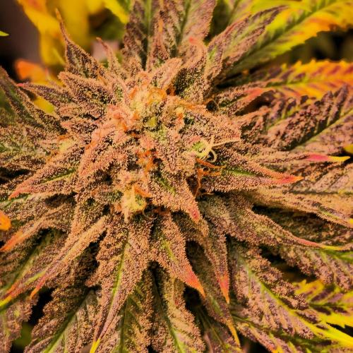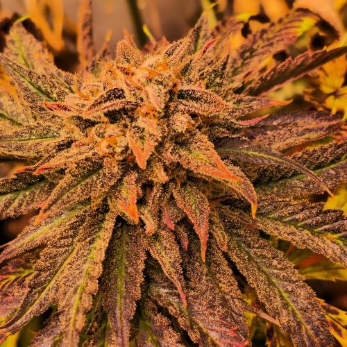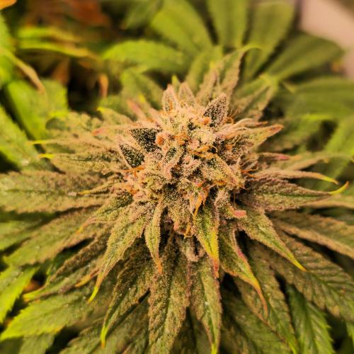 Langsam treten auch erste Farbverläufe zutage – zarte Violett- und Orangetöne mischen sich in das satte Grün und deuten an, wohin die Reise geht. Die Pflanzen setzen nun alles daran, ihre Energie in die Blütenproduktion zu stecken. Trichome schimmern im Licht, Harzbildung nimmt spürbar zu, und ein intensiver, vielversprechender Duft liegt in der Luft.