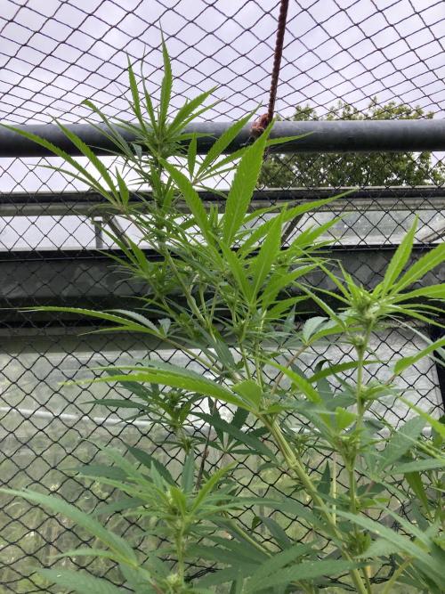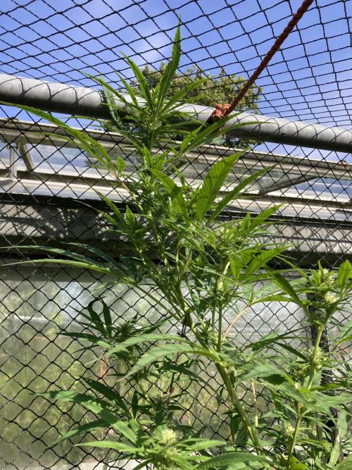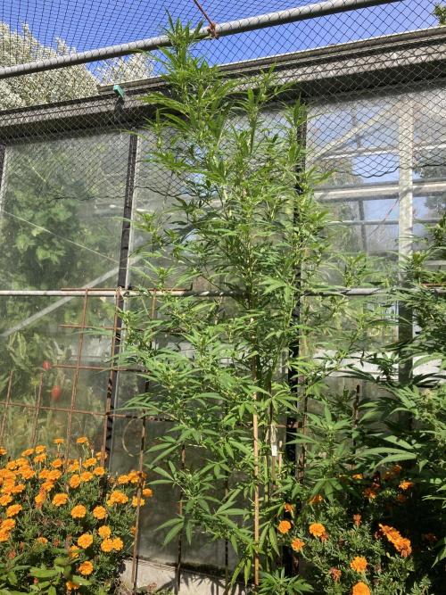 Black Runtz kept growing and reached the net above her. She is 210 centimetres now. I decided to bend her to the side with a piece of string.