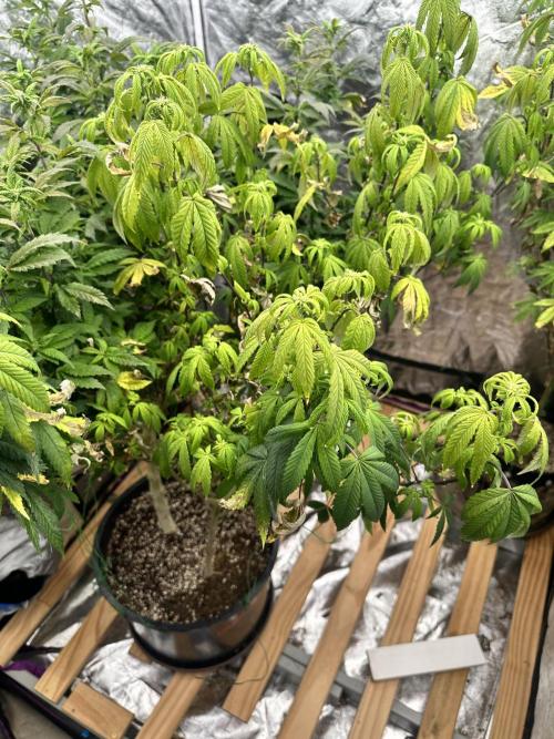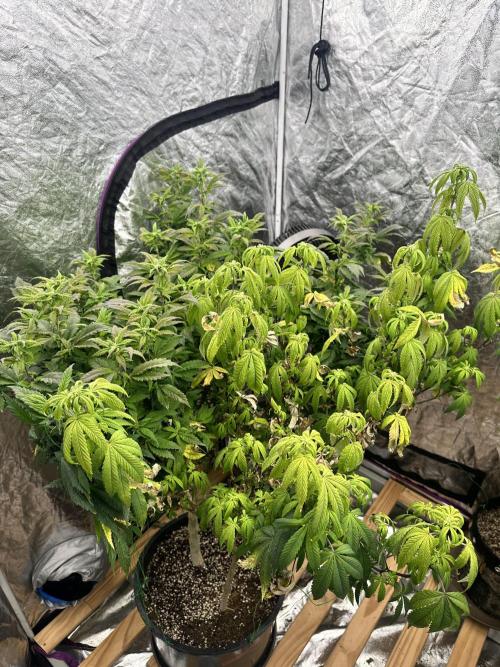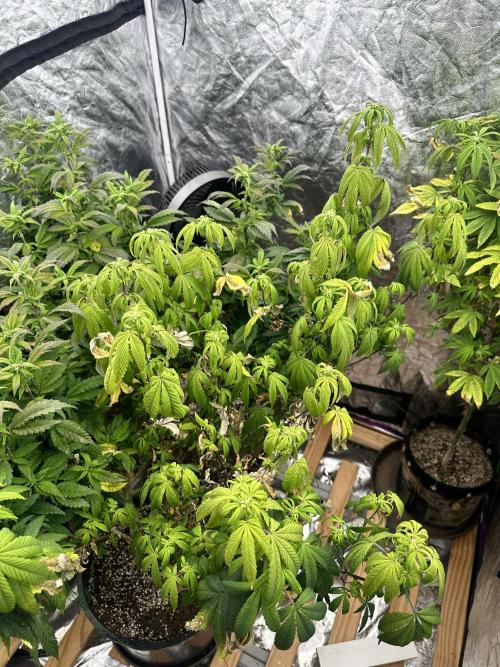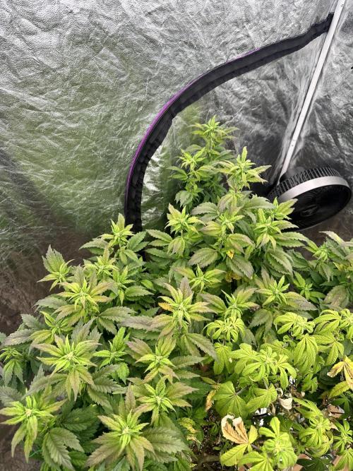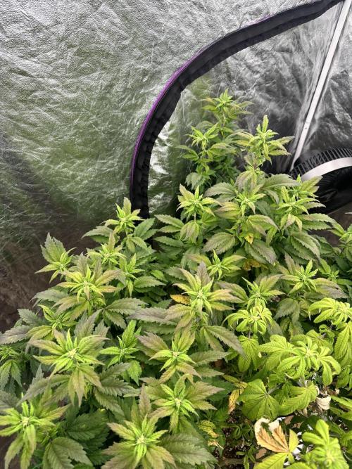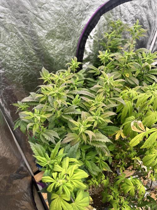 The tent’s alive with energy this week 🌞🌿! Red Hot Violet is absolutely thriving 🔥💜 — strong structure, healthy stretch, and bud sites forming beautifully 🌸💎.On the flip side, Amaretto Sour 🍋 seems to be getting a bit choked out 😕🌱 — growth has slowed and she’s fighting for space and light 🌤️. Planning a careful separation this week 🧤💧 by filling a tote with water and gently working the soil apart