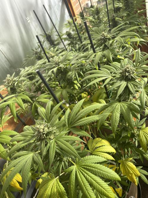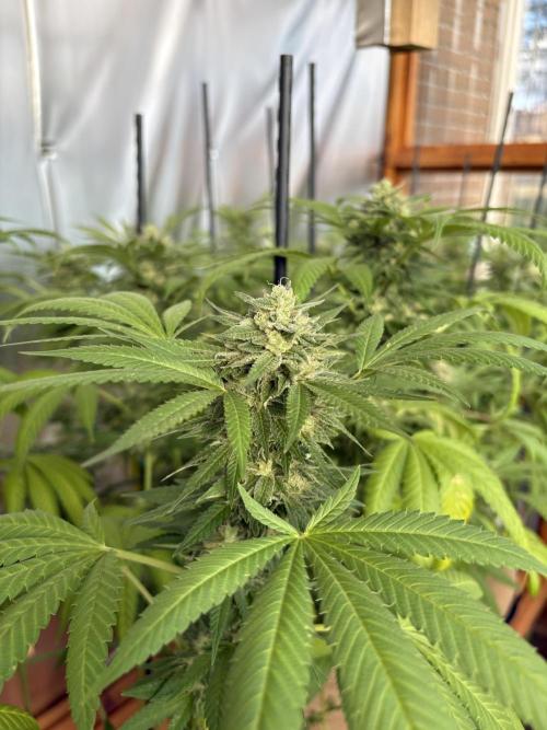 Lemon Orange #1 is a healthy specimen but has signalled a bit of fertigation burn at tips of leaves. It is minor and at this stage, nothing to worry about. Blooms are dense, but notably small. A vast majority of pistils have wilted and are starting to recede into calyxes. Trichome production is sufficient but not quite as abundant as I have witnessed from other phenotypes of this strain. Upon inspection, a larger proportion of trichome heads are clear, some cloudy, very few amber, and in a few spots could see purple colourations at tips of sugar leaves and calyxes. I believe this specimen is most likely to be harvested before all others in the greenhouse.