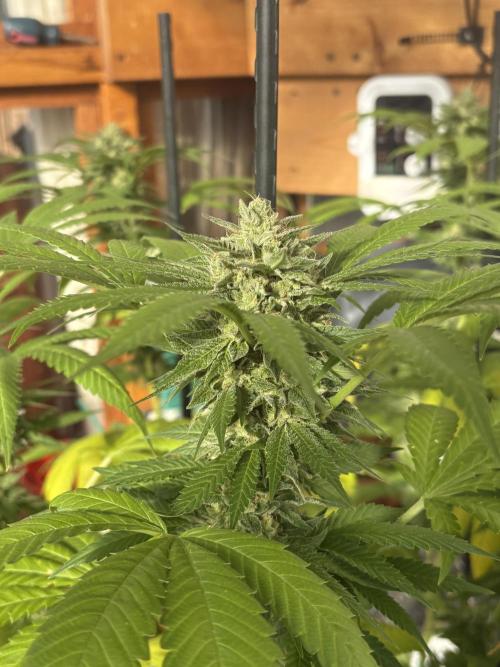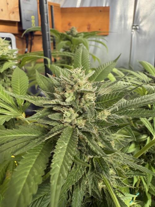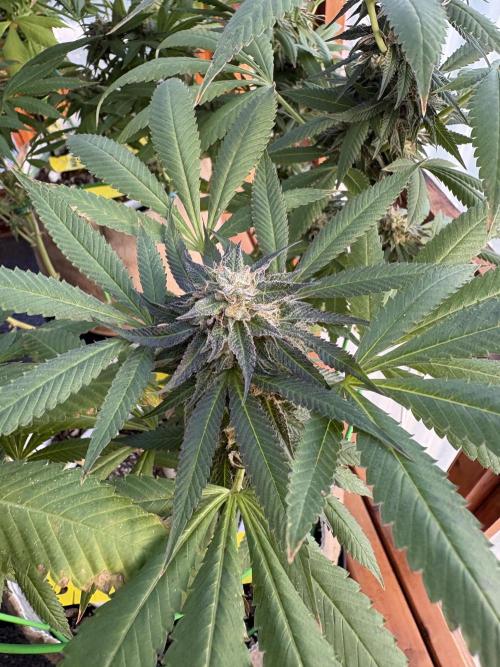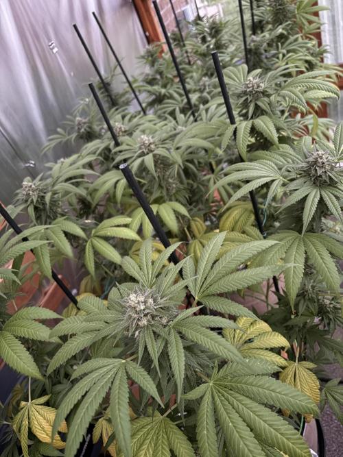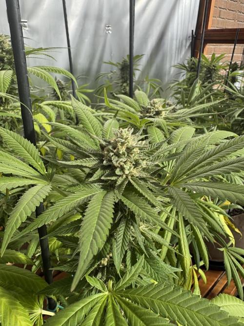 Lemon Orange #2 is furtherest along in senscence and is soon to drop lower leaves. Upper fan leaves are slowly fading from green to yellow. Flowers are large and comparable to Lemon Orange #1 and #2 of the Summer of 2024, have very good trichome production and smell strongly of lemon with an earthy background. Pistils have largely wilted, however those at the apex of flowers are still white. Calyxes have plumped, but they're not quite ripe yet. Upon inspection, clear trichome heads outnumber cloudy ones on calyxes, while at edge of sugar leaves there are quite a few amber heads.