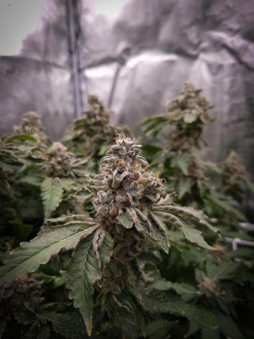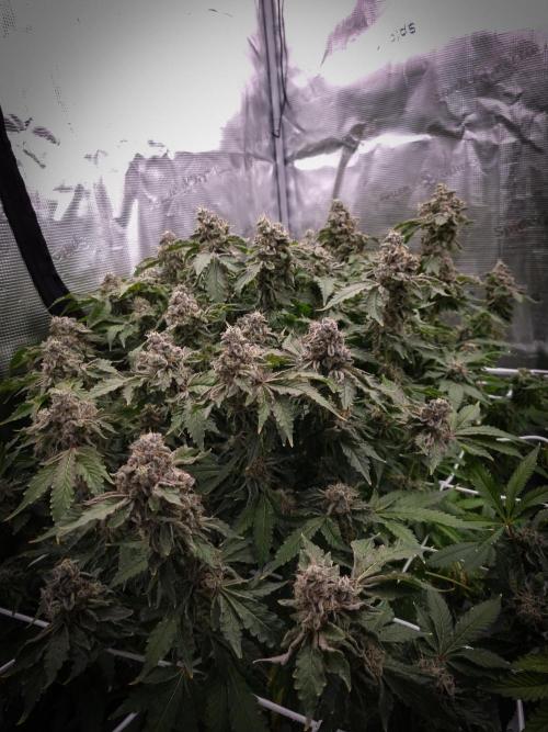 HippyHemulen Going to chop her day 64. Oh my god she have beautiful dense rock hard buds which you cant even squeeze, some purple hues too. Covered fully with thrichomes and is one of the most iced what ive grew. Smell is like tropical, fruity, sour (like yogurt) and little sweetness.