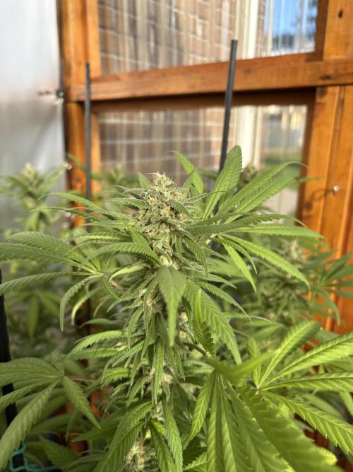 Blue Dynamite #1 is a healthy specimen that is producing larger blooms than her sister. The flowers are dense, with smallish calyxes, and not particularly leafy. A vast majority of pistils are white, and for those that have wilted, they’ve turned a bright orange colour. Trichome production is quite good, but trichome heads are much smaller than those on the Lemon Orange specimens in the garden. Upon inspection, a larger proportion of trichome heads are clear, some cloudy, very few amber. Uniform paling of leaves from bottom to top has begun.