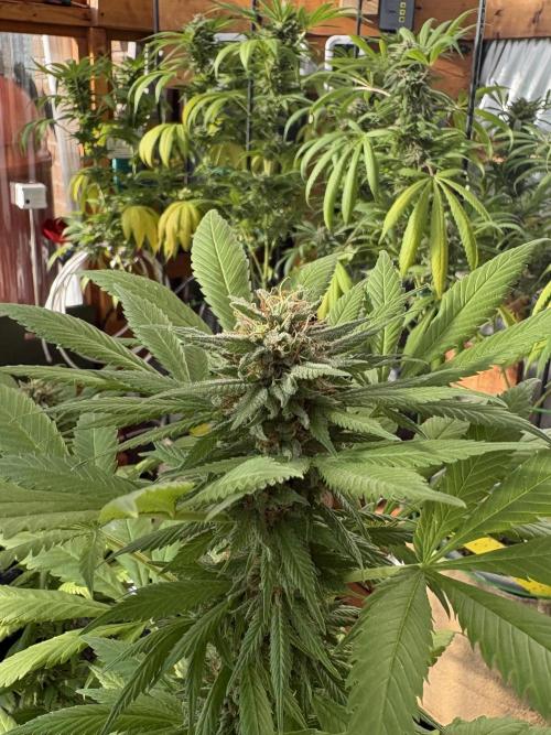 cultivars SEPTEMBER 20th to SEPTEMBER 26, 2025 Sunrise: 07:39 | Sunset: 20:01| Total Daylight: 12:22 Overall a pretty good week of weather. Started with a couple of days of mostly cloud-cover, then it moved to a final few days of open sunny skies. Temperatures outside were great, and the greenhouse benefitted. Purple Romulan is growing well, as a small, stout plant. It is not flowering particularly quickly, nor is her trichome production very abundant. All the same, it appears healthy with a nice stacking bud formation with good inter-nodal spacing. Stems are rigid, and holding up fine. At best the plant has another 30 days to get to a state of readiness to harvest, so the next 2 weeks are pretty critical to gaining some size and mass. Fingers crossed the weather cooperates with an abundance of sun, and that I have given the plants what they need to bulk up. DAY 134 Cloudy day, with a few sunny breaks; Temperatures were within needed ranges; 2L top water with Aerated Compost Tea (recipe listed in Nutrients section of this Diary Post, added in order, with Yucca added after 24 to 36hr brew); Cloudy day, with a few sunny breaks DAY 135 Dark and cloudy day, overnight rain, and light rain throughout the day. Temps are fine, but humidity too high (55% to 65%). DAY 136 Mix of sun and cloud, good temperatures; Humidity levels better during the day, a little high overnight DAY 137 Nice sunny day DAY 138 Smaller plant not drinking as much as larger specimens in the garden. No watering today. DAY 139 Greenhouse held at 19C overnight without issue; 500mL in the afternoon (displayed some droop).