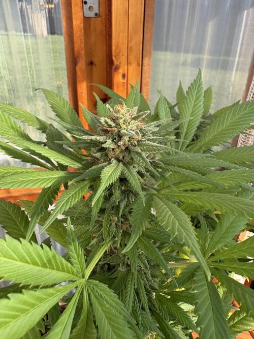 cultivars OCTOBER 18th to OCTOBER 24TH Sunrise: 08:31 | Sunset: 18:50 | Total Daylight: 10:19 Weather over the past week saw several consecutive days of full cloud cover and rainy periods. Greenhouse has held temperatures during the day, and only dropped below 10C once (Day 168). Good periods of sun on Day 167 and 168, with the forecast looking sunny for the next few days. I suspect that will help along the ripening process as the plants process nutrients from the fan leaves during the fade. There hasn't really been any issues with humidity levels, as it has hovered in and around 40% to 45% RH Purple Romulan isn't as near to ripe as I'd like, with many trichome heads still clear, with only a few cloudy. Not a lot of time left as it is getting quite cold outdoors, and honestly there isn't a lot of sunlight now that we are down to 10 hours. DAY 162 2L of plain rainwater (cold) applied to each specimen. DAY 163 n/a DAY 164 15C in greenhouse in the morning; Cloudy and cool day overall, but greenhouse holding temperatures above 19C and plants are clearly going through senescence. DAY 165 Steady rain overnight, with armer temperatures; Greenhouse held overnight at 17.5C and 50% RH. Cool, cloudy and rainy day (high of 9C, 97% RH, but greenhouse and the associated equipment performing as designed and holding temperatures at 19.5C with humidity ranging from 40% to 45%. DAY 166 Cool and rainy overnight (6C intermittent light rain). Greenhouse held to 16.5C and 41% RH. Noticed some droop so provided 1L of plain rainwater (cold) via drip in the afternoon to each specimen and everyone perked up thereafter. Temperatures reached 19C for much of the day, with 43% humidity. Temperatures outdoors were a high of 7C, with 80% humidity (or more) during the day. Remained overcast for much of the day, but there was a couple of periods of increased brightness. Plants are doing well, all fading; Purple Romulan's long and abundant pistils have only began to wilt to a bright orange colour wholeheartedly over the last 7 days. Flowers are of decent size, have a typical hybrid shape with trichome production that looks to be average. Smells of pine but has a sweetness as an undertone. Trichome heads on calyxes remain mostly clear. When rubbing fingers over sugar leaves, this plant is notably greasy in comparison to any other specimens in the garden. DAY 167 Overnight low of 2C, greenhouse held at 12.5C and 41% RH. After a cloudy cool morning, the sun broke through and warmed up the greenhouse shortly after the noon hour. Exhaust fan even came on intermittently to reduce temps below 24C. Humidity was ideal all day, in and around 40%. After noting some droop, applied 1L of plain rainwater (cold) via drip. This may be the last watering of the season. I think it will be possible to decommission the irrigation system for the winter over the coming weekend. I can pull 20L of water for use either for this crop and/or the mother tent. DAY 168 Greenhouse 9.5C (-2C outside) in the morning with 40% RH. Sunny morning, with greenhouse warming to over 10C by 9:30AM; Exhaust fan kicked in to hold temperatures at 24C just before the noon hour.