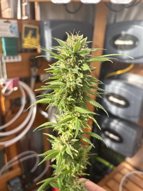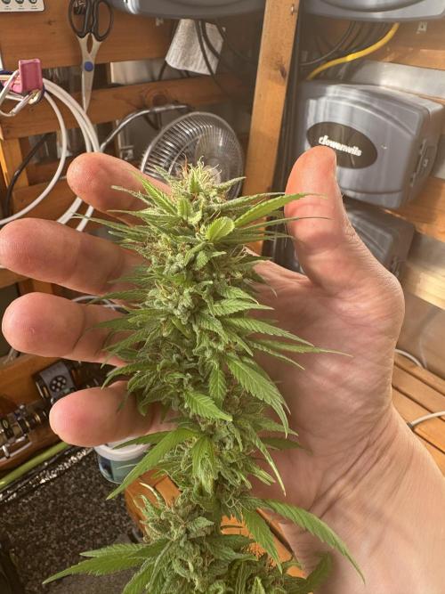 cultivars OCTOBER 25h to OCTOBER 26th Sunrise: 08:34 | Sunset: 18:47 | Total Daylight: 10:13 Nice and sunny on October 26, 2025 (Day 170), and I decided the plants needed to come down. The weather is getting cold, and near the tipping point on my greenhouse environment. Purple Romulan would have most certainly benefitted from another week, but it just wasn’t to be. The lone specimen of this strain I planted germinated well, grew a bit slowly and matured to a smaller plant with smaller flowers. Inter-nodal spacing was quite compact and flowers were a bit leafier than desired. There were hints of blue and purple colourations at the tips of sugar leaves and calyxes but not pronounced. The plant and flowers smelled strongly of pine and in late flower began to have a sweet floral undertone. Trichome production was adequate, and notably greasy when rubbed between fingers. The yield was visually average. The harvest process was straight-forward, with removal of fan leaves and others with longer petioles exiting the flower, then each of the 8 main branches were removed from the plant. I did not take a cutting from this plant, and depending how it smokes, tastes and its effects, it may get another run in the future.