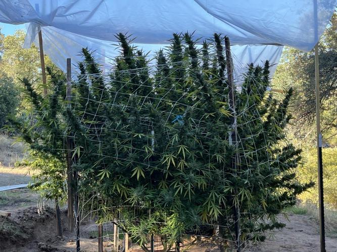 Northfork 9-7-25. What can I say the Apple fritter continues to do very well have no insect damage and no major issues to mention. The plant has been completely trellis for the last time. The bud structure is really great. The branches are really large. Really happy plant is doing well. top dressed it’s last top dress with one cup each of flower, finisher, primo Hydroslate, pure kelp, dry, and soluble seaweed extract as well as Azomite. All of these are micronized and soluble powdered so the plant should uptake the nutrients much faster than traditional top dresses. Don’t have any large granules that are gonna take time to break down and water in from here on out it will be water with its last two sugar water drenches, which I will use boogie brix, and black strap molasses brixs. with all of these nutrients and amendments in place I will let the girls ride out their last few weeks with Just nice rich mountain water to ensure they use every bit of the sugar, phosphate and potassium for frosty buds with heavy resin and terp production .
