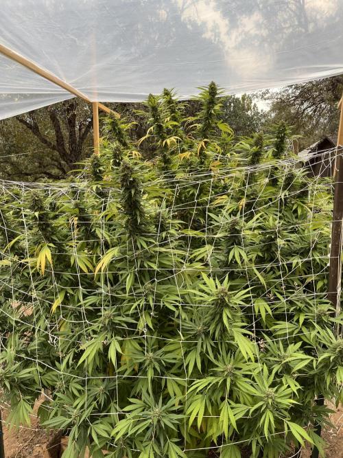 Northfork Week six all the plants have been doing very well. A few of them have suffered some broken tops because of me but other than that doing well the leafhoppers have been doing their best to do some damage but nothing major and the hole seem to be holding water very well I’ve been minimally watering only about once a week just a couple gallons. They seem to be retaining enough water, giving them their boogie brew tea every seven days and their pure protein with soluble seaweed every four days that’ll be the schedule till the end keep on pulling them down and stretching them out trying to get those branches to level out and grow more tops upwards. These plants this year are definitely larger than my previous ones, which surprised me I started these a little later, but they are much taller and growing much more vigorous than the last and the last were very large so high expectations for these week six everybody’s doing great. ..