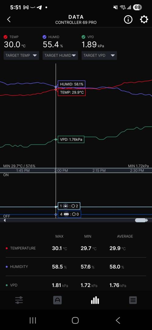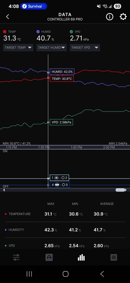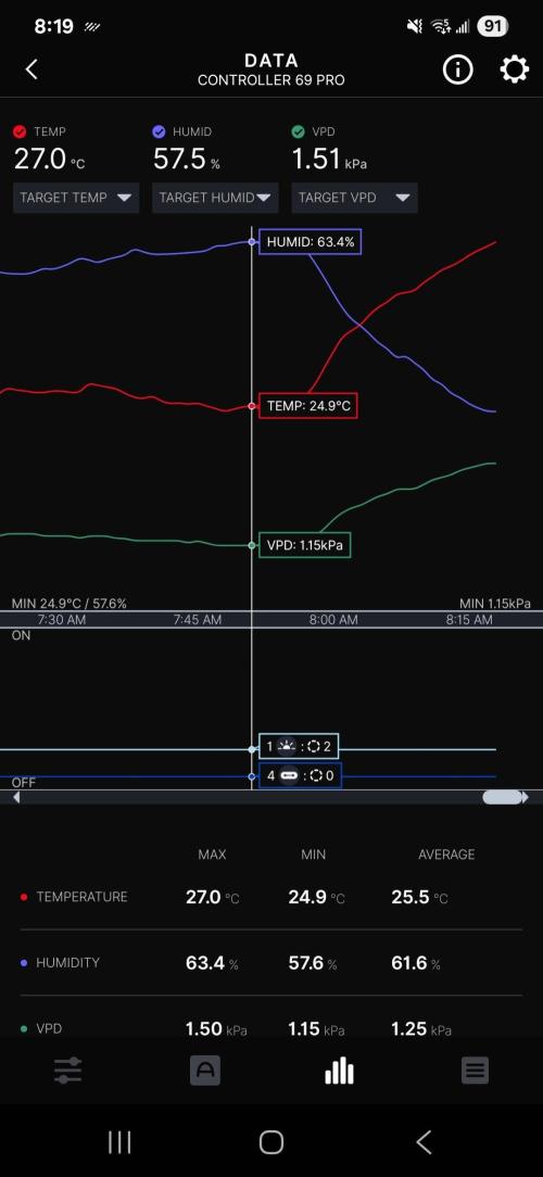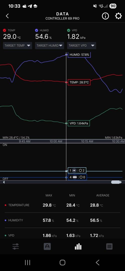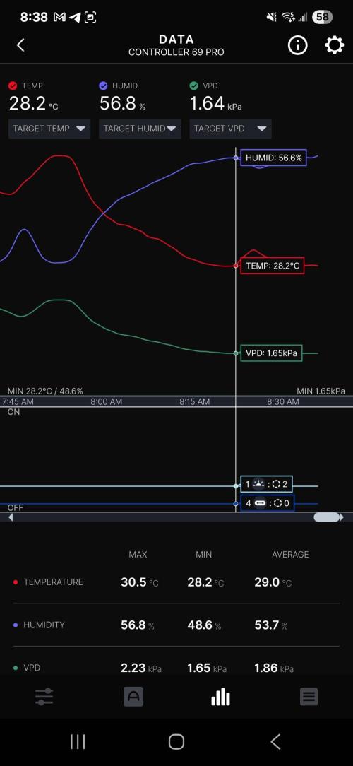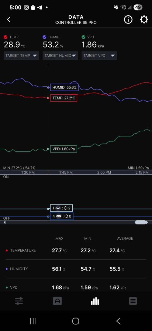 Temps & RH have been pretty good so far today, I'm not able to hit 80% using the Levoit humidifier in the 4x4 but I've been able to maintain 65 - 70% RH throughout the day a couple hours after the light has turned on