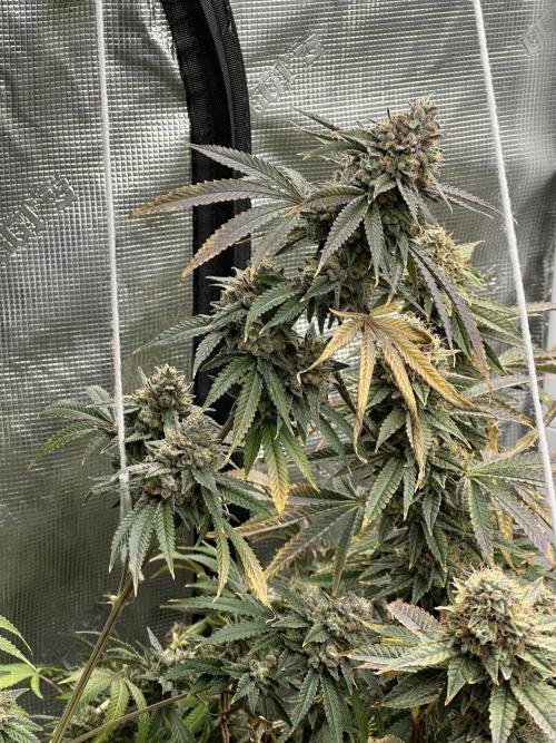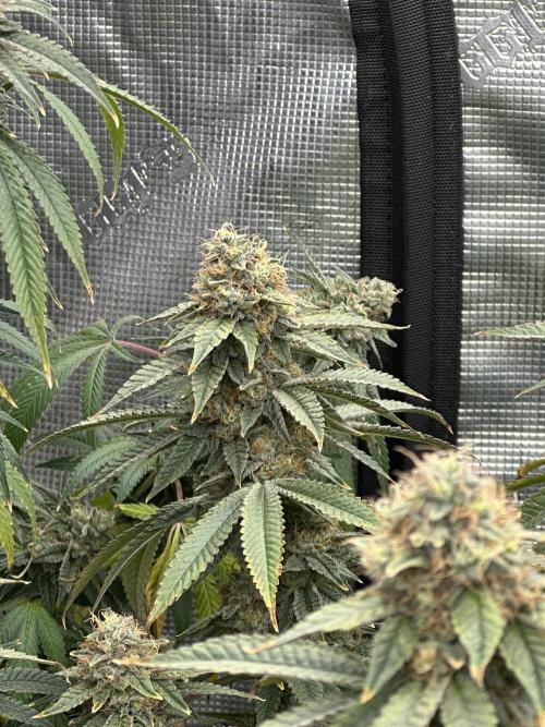 FireAntTheGrower Updating 3rd week in flowering stage as you can see the buds and right now just regular watering . When dry back completely which not supposed too but I had to catch them when the light is on. At midnight.. I be at work already so when I get off gotta catch em before they going to sleep. So far so green and good. Starting to smell the tent or room a bit . Definitely grab some smell goods so won’t spread across neighbor.
