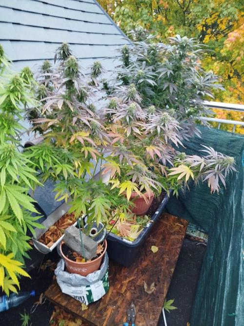 GermanGrow182 Der Herbst ist da. Sonne , Wind Wind Wind und Regen wechseln sich ab.larry ist n Blüte Woche 5, die AK in woche3 . Die buds werden dicker und dicker 😁. Noch keine Anzeichen von Schimmel. Die Nacht Temperatur ist noch nicht unter 8 Grad gewesen, kaum fade zu erkennen.