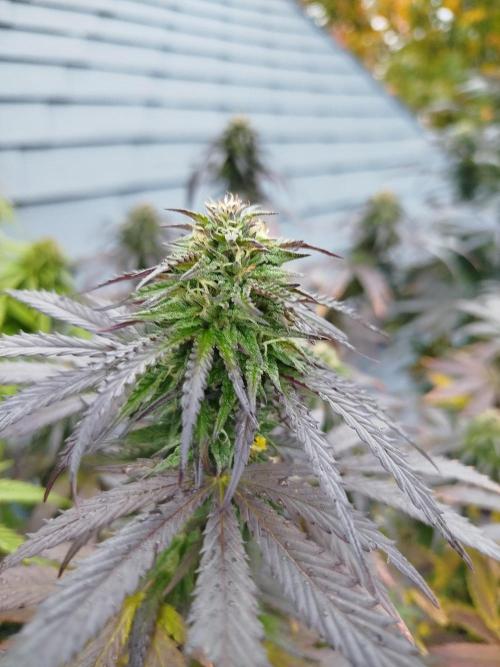 Die AK sind gut in der vollblüte angekommen und nutzen jeden Sonnenstrahl, um Masse in den Blüten anzusetzen. Die AK zeigt purple. Sattviolett aufgrund der letzten 3 Nächte unter 5 Grad.