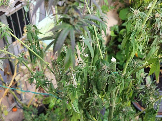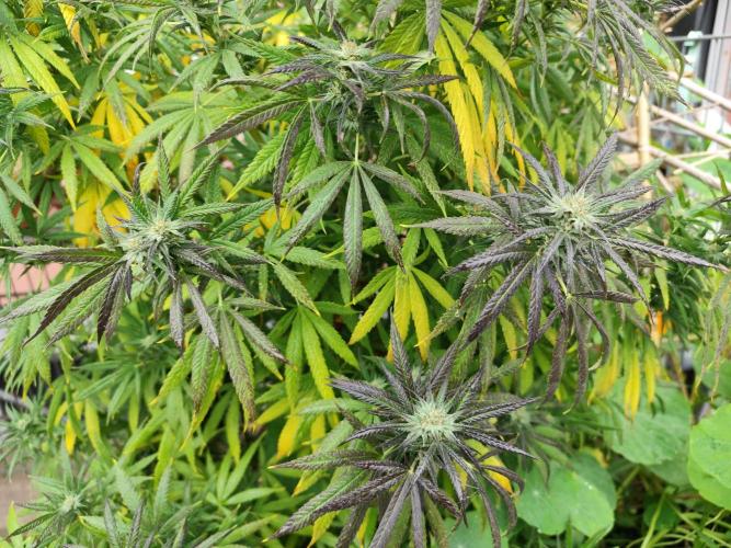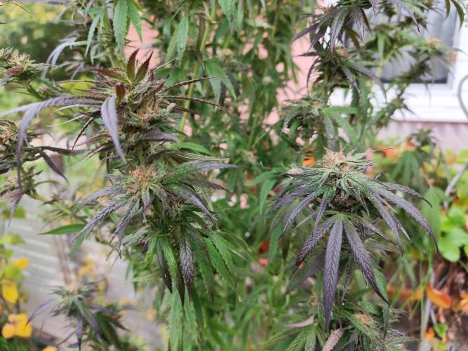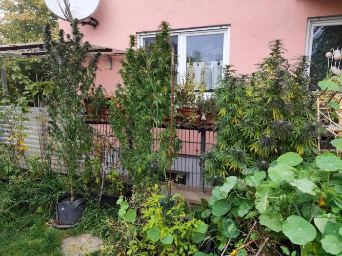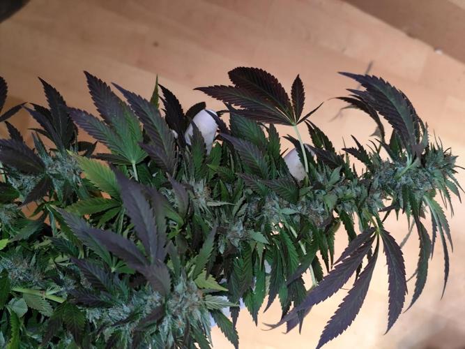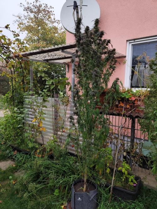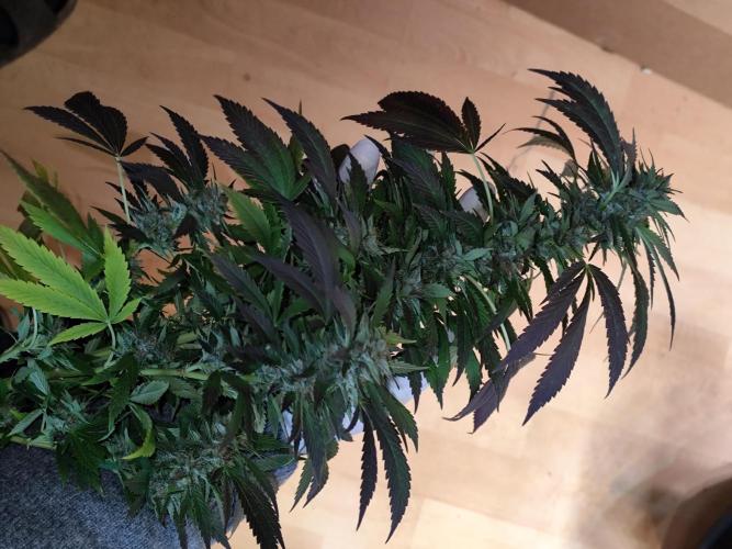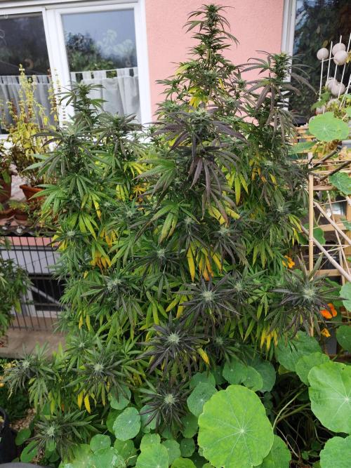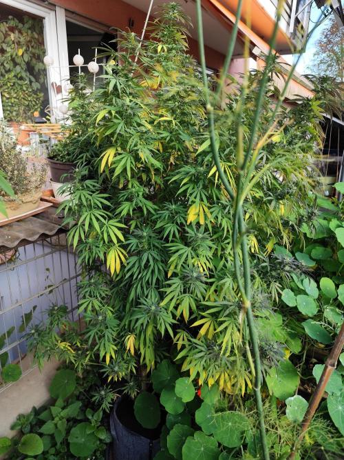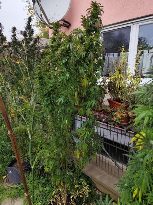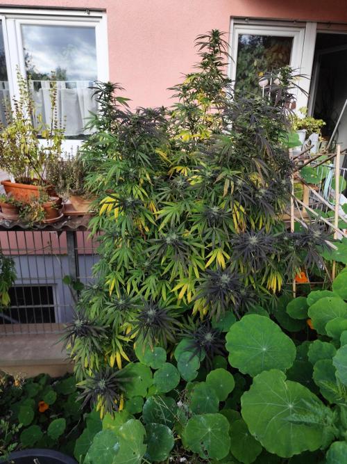 Tag 211: Für heute waren 20°C vorhergesagt, tatsächlich steckt die Sonne hinter dickem Hochnebel und es sind gerade mal 14°C. Heute Nacht geht's mit 2 °C Richtung Gefrierpunkt. Alle drei Ladies purpeln im Laub. Sie bekommen nur noch pures Brunnenwasser. Der abgebrochene Ast der Special Kush ist wieder komplett angewachsen.
