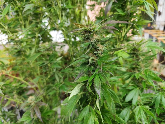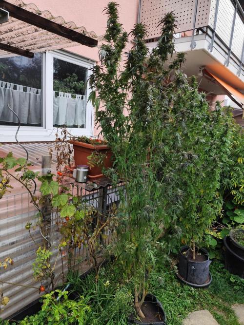 Tag 187: Die drei Ladies haben sich unter der Obhut meiner Nachbarin sehr schön entwickelt. Es hatte sehr viel geregnet, hinterm Rückhaltebecken war ein See und der Bach war voll bis zum Rand. Der Brunnen ist auch wieder offen. Die drei großen stehen jetzt wieder in der Sonne, heute hat's nur ein paar Wölkchen. Die Power Flower fem. ist jetzt 215 cm hoch, die Special Kush #1 fem. 205cm und die Royal Medic fem. 175 cm. Der Blütenzuwachs ist jetzt endlich deutlich zu erkennen.
