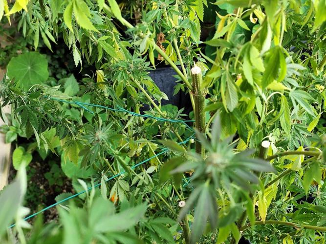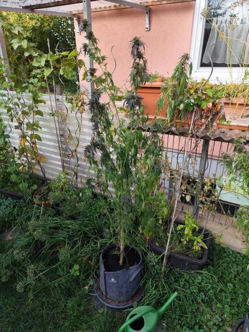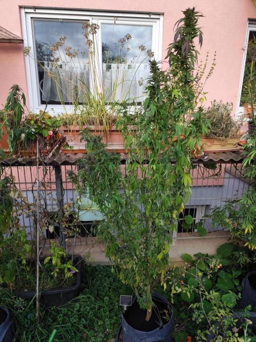 Tag 155: Endlich wieder 30°C und strahlender Sonnenschein bei leichtem Wind. Die drei Großen sind hinten am Zaun befestigt, so viel Coctailsauce kann ich gar nicht in die Töpfe füllen damit die bei stärkerem Wind stehen bleiben. Die Power Flower fem. ist jetzt 2 Meter hoch, die Special Kush #1 fem. misst 190cm und die Royal Medic fem. 155 cm. Alle haben mehrere Hauptstämme bekommen und sind sehr buschig.