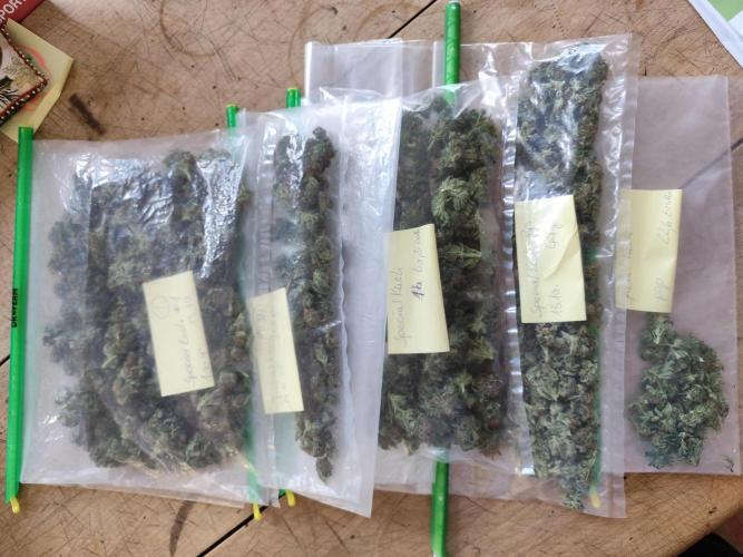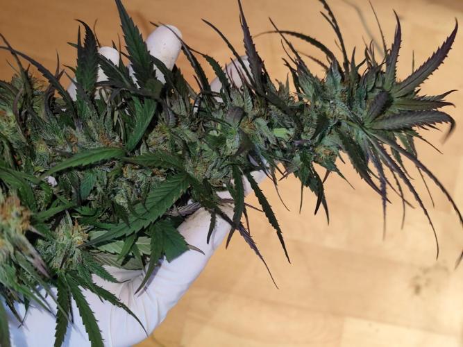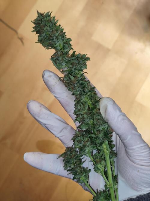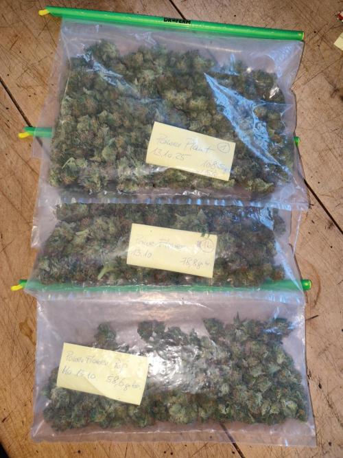Tag 220: Heute ist wieder Mondhöchststand, nur 5 Tage nach Vollmond, Blütetag, letzter Erntetag und erster Aussaattag, ideal zum Ernten. Dieses Mal habe ich von jeder Dame einen Film der Trichome gemacht, deutlich zu sehen sind die vielen trüben Trichome und einige Bernsteinfarbene. Passt. Von der Power Flower fem. und von der Special Kush #1 fem. habe ich jeweils die 3 stärksten Äste geholt. Ich bin sehr froh, nur eine Teilernte gemacht zu haben, sonst würde ich noch den Rest der Woche schnibbeln. Es gibt Budtrimmmaschinen, vielleicht werde ich mir nächstes Jahr eine Zulegen, mal sehen. Bisher habe ich immer die ganze Pflanze geerntet und zum trocknen aufgehängt und dann trocken getrimmt. Dieses Mal verwende ich die DryFerm Bags, somit wurde zum ersten Mal Nass getrimmt. Das Ergebnis war eine Punklandung, 256 g bei der Power Flower und 257 g bei der Kush, nach dem Trimmen. Die Royal Medic bleibt wie sie ist. Jetzt bin ich neugierig, wie sich die Power und die Kush noch entwickeln.