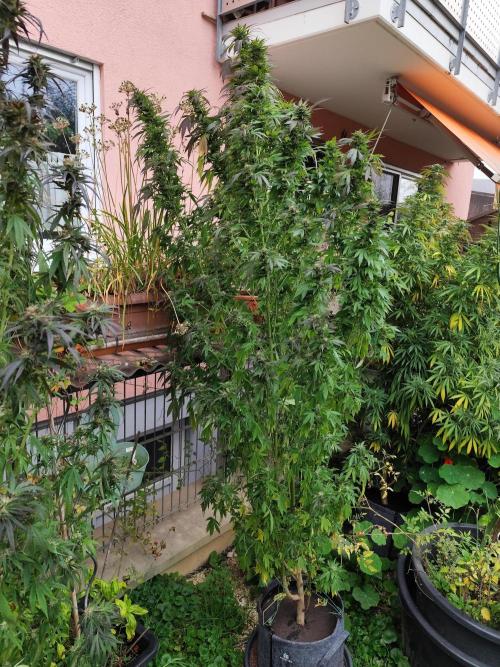 Tag 149: Wie man sieht klappt das mit dem Wegräumen wenn's regnet nicht immer. Wenigstens die ersten Sonnenstrahlen des Tages konnte ich einfangen. Mitte nächster Woche soll's besser werden. Obwohl das Trio den größten Teil der letzten Woche unterm Balkon zugebracht hatten, sind alle drei wieder gewachsen. Die Power Flower fem. misst jetzt 190 cm, die Special Kush #1 fem. 180 cm und die Royal Medic fem. 150 cm.