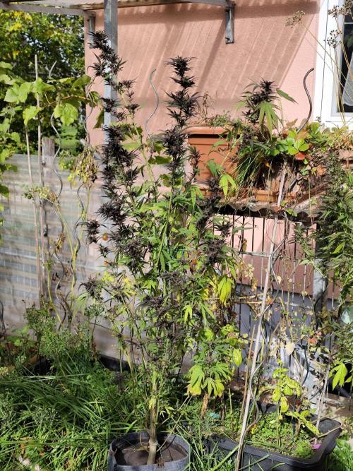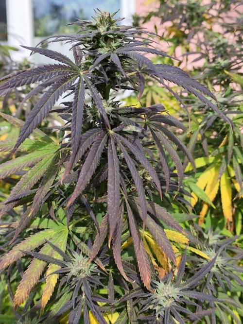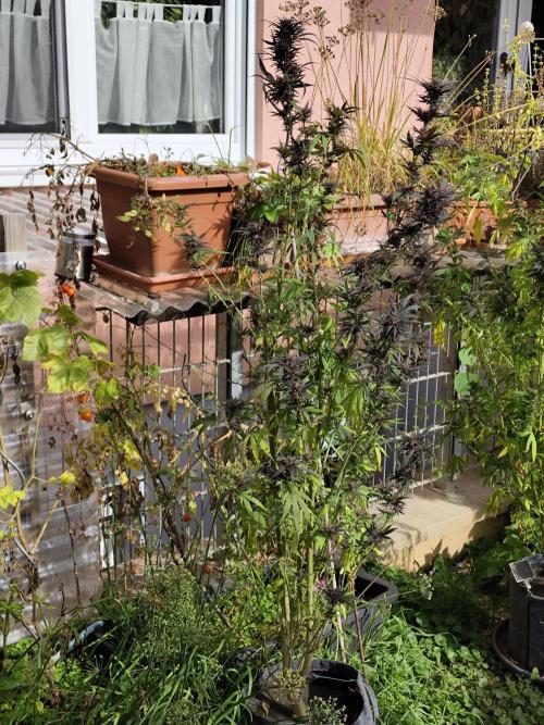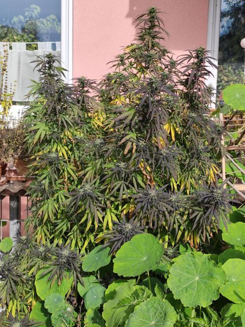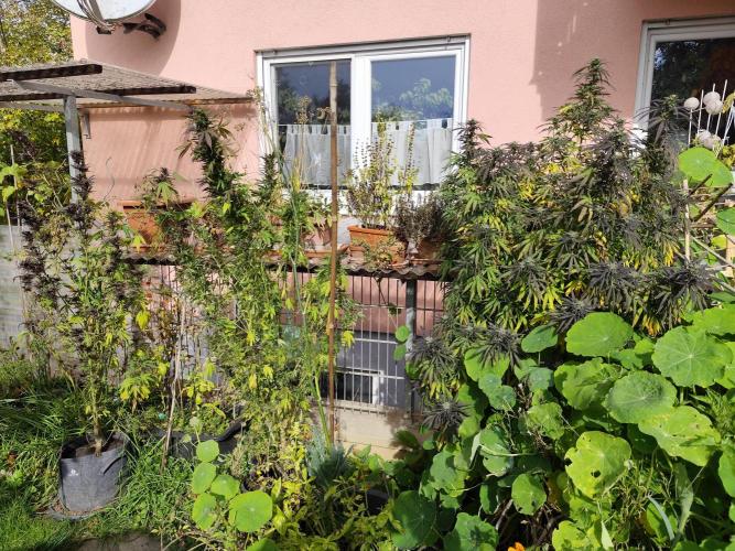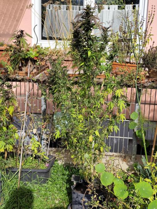 Tag 211: Für heute waren 20°C vorhergesagt, tatsächlich steckt die Sonne hinter dickem Hochnebel und es sind gerade mal 14°C. Heute Nacht geht's mit 2 °C Richtung Gefrierpunkt. Alle drei Ladies purpeln im Laub. Sie bekommen nur noch pures Brunnenwasser. Der abgebrochene Ast der Special Kush ist wieder komplett angewachsen.