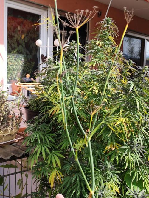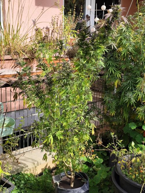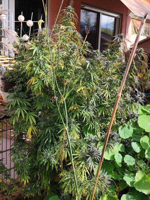 Tag 155: Endlich wieder 30°C und strahlender Sonnenschein bei leichtem Wind. Die drei Großen sind hinten am Zaun befestigt, so viel Coctailsauce kann ich gar nicht in die Töpfe füllen damit die bei stärkerem Wind stehen bleiben. Die Power Flower fem. ist jetzt 2 Meter hoch, die Special Kush #1 fem. misst 190cm und die Royal Medic fem. 155 cm. Alle haben mehrere Hauptstämme bekommen und sind sehr buschig.