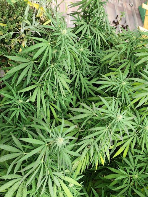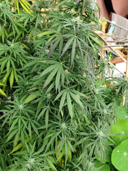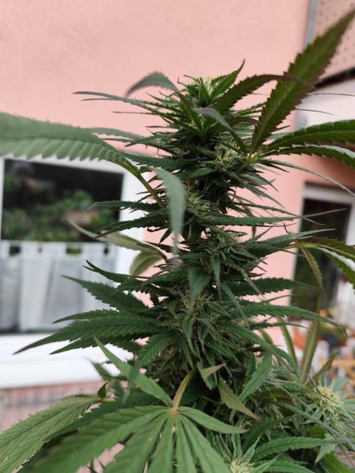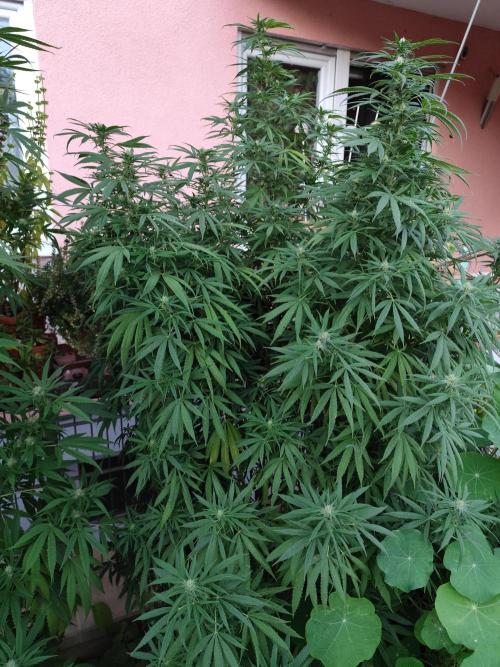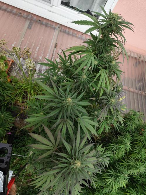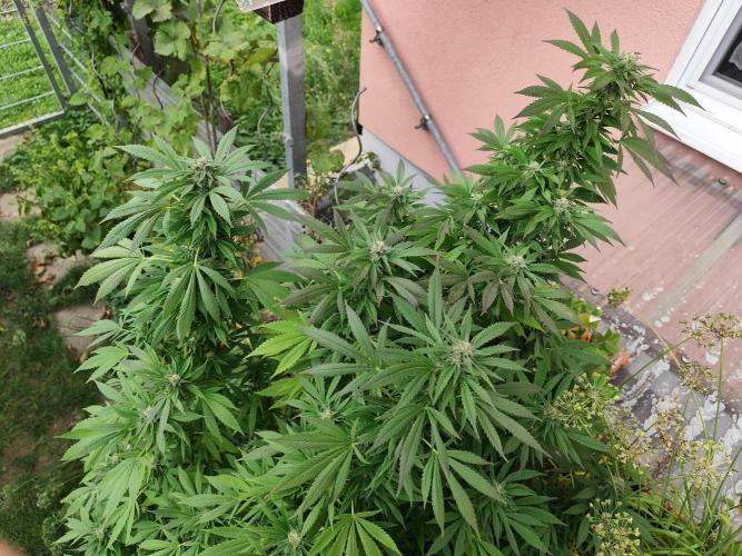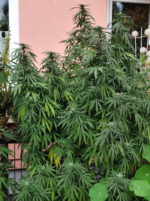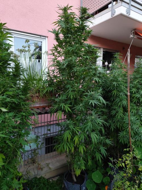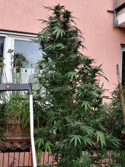 Tag 187: Die drei Ladies haben sich unter der Obhut meiner Nachbarin sehr schön entwickelt. Es hatte sehr viel geregnet, hinterm Rückhaltebecken war ein See und der Bach war voll bis zum Rand. Der Brunnen ist auch wieder offen. Die drei großen stehen jetzt wieder in der Sonne, heute hat's nur ein paar Wölkchen. Die Power Flower fem. ist jetzt 215 cm hoch, die Special Kush #1 fem. 205cm und die Royal Medic fem. 175 cm. Der Blütenzuwachs ist jetzt endlich deutlich zu erkennen.