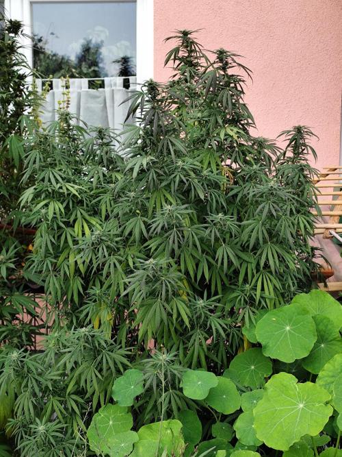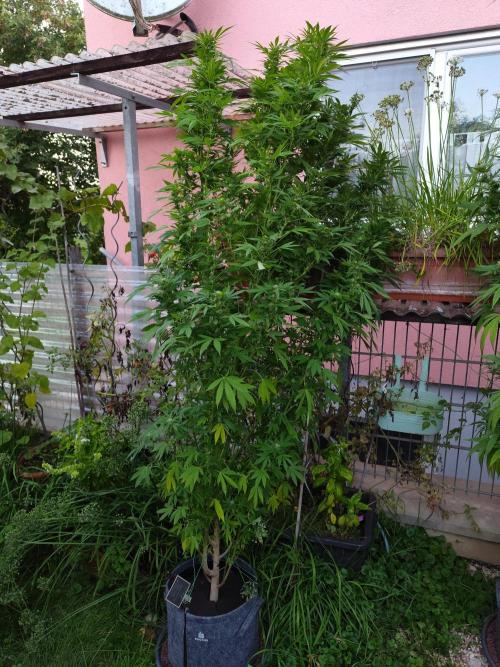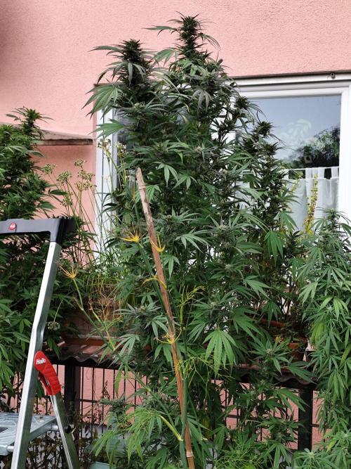 Tag 155: Endlich wieder 30°C und strahlender Sonnenschein bei leichtem Wind. Die drei Großen sind hinten am Zaun befestigt, so viel Coctailsauce kann ich gar nicht in die Töpfe füllen damit die bei stärkerem Wind stehen bleiben. Die Power Flower fem. ist jetzt 2 Meter hoch, die Special Kush #1 fem. misst 190cm und die Royal Medic fem. 155 cm. Alle haben mehrere Hauptstämme bekommen und sind sehr buschig.