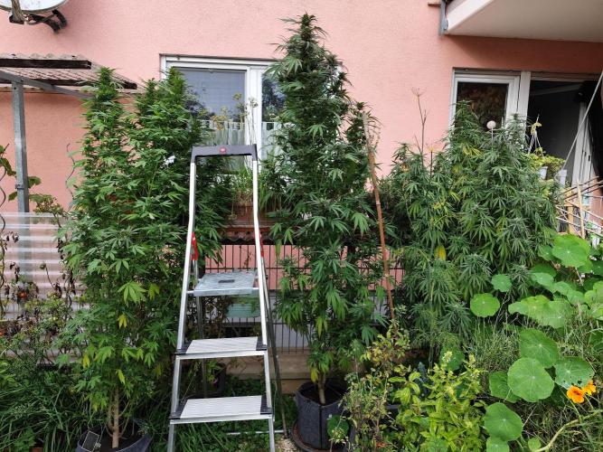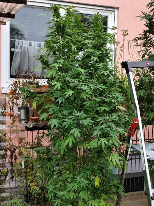 Tag 149: Wie man sieht klappt das mit dem Wegräumen wenn's regnet nicht immer. Wenigstens die ersten Sonnenstrahlen des Tages konnte ich einfangen. Mitte nächster Woche soll's besser werden. Obwohl das Trio den größten Teil der letzten Woche unterm Balkon zugebracht hatten, sind alle drei wieder gewachsen. Die Power Flower fem. misst jetzt 190 cm, die Special Kush #1 fem. 180 cm und die Royal Medic fem. 150 cm.