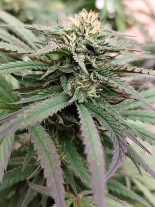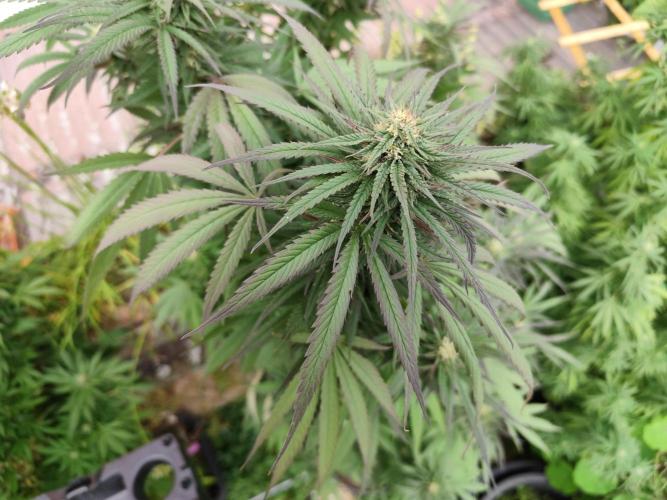 Tag 211: Für heute waren 20°C vorhergesagt, tatsächlich steckt die Sonne hinter dickem Hochnebel und es sind gerade mal 14°C. Heute Nacht geht's mit 2 °C Richtung Gefrierpunkt. Alle drei Ladies purpeln im Laub. Sie bekommen nur noch pures Brunnenwasser. Der abgebrochene Ast der Special Kush ist wieder komplett angewachsen.