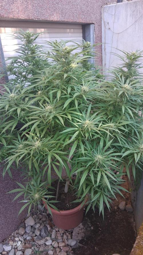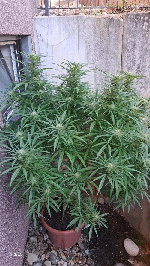 Von morgens bis nachmittags 17 Uhr bekommt die Zombie Kush direkt Sonne danach liegt sie im Schatten. Vor Schnecken und anderen Ungeziefer sollte sie sicher sein.