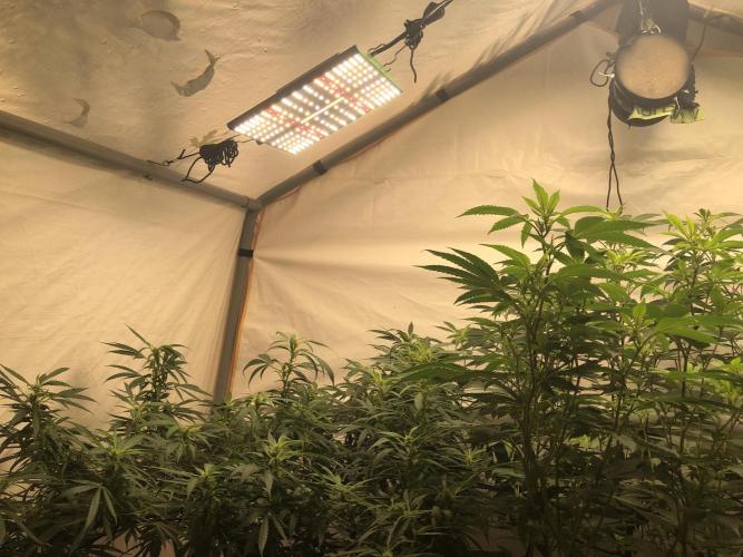 MindFlowers68 I finally got my other light out in the greenhouse, and move the other two on the sides. I wasn't sure how it was going to put the lights up but this is all I can really think to do. I also trimmed up the bottoms and lollipoped them. The humidity has been out of control over 90% some nights, and started to see little bit of PM. It looks like we're may be condensation drip down or something. The other plants outside started to get a little bit too from so I applied some UV-C light for a few minutes. I bought special glasses and then I remembered I have a welding mask so I use that in conjunction with them and put on some snowboard gear and thick leather gloves while I was using it. I picked off the little bit of pm I saw, and then a few days after I applied the light I'm not seeing anything so finger crossed.